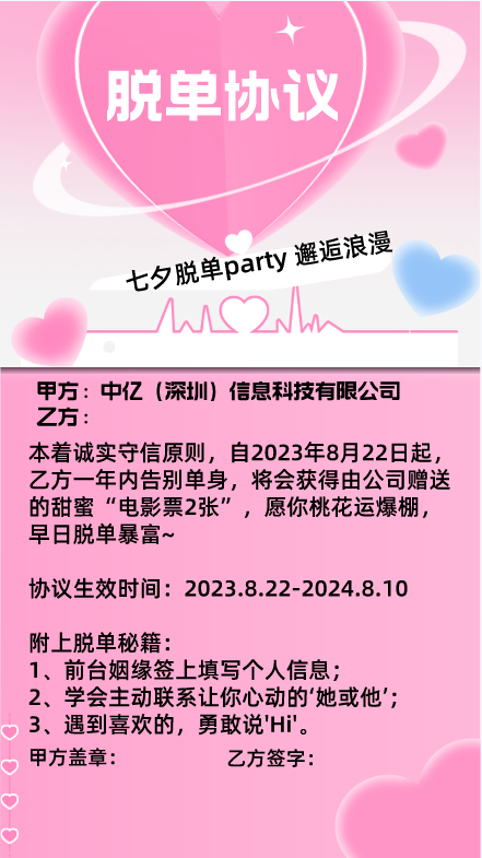 签下“七夕脱单协议”自2023年8月22日起的平博pinnacle体育人在一年内告别单身,将会获得由公司赠送的甜蜜“电影票2张”。