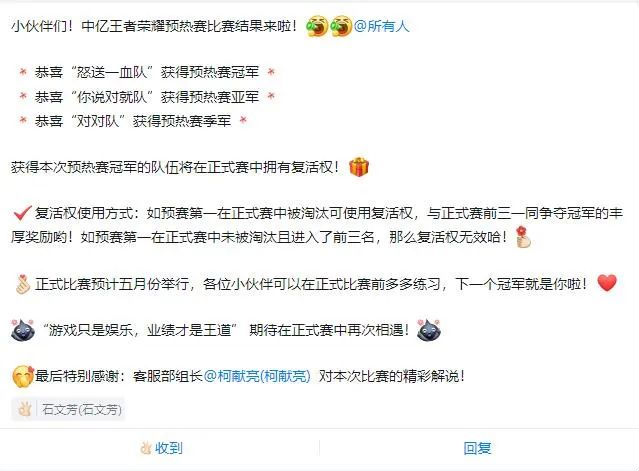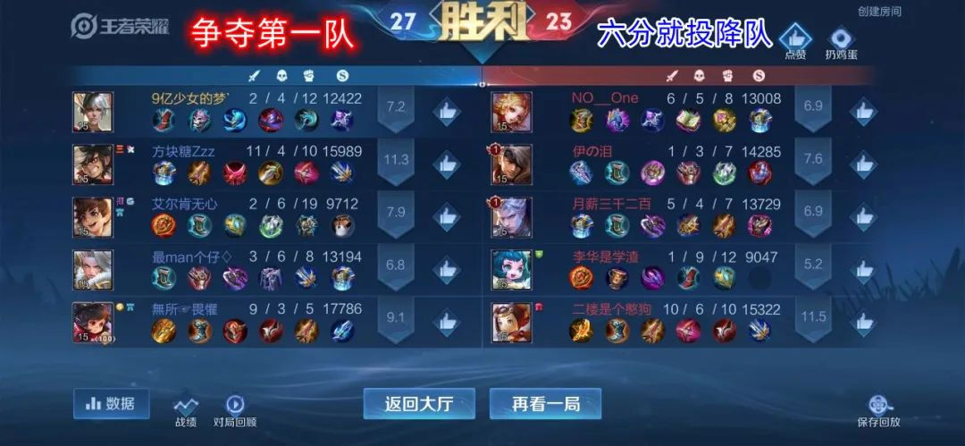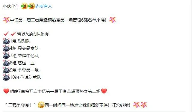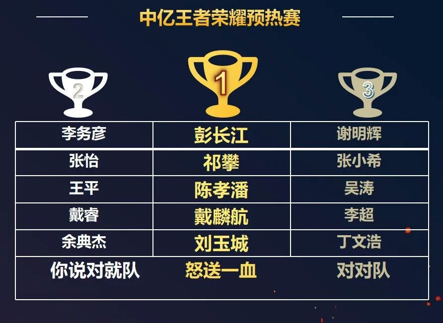 经过一轮的厮杀,“怒送一血队”、“对对队”、“你说对就队”从中脱颖而出,一路过五关斩六将,进入王者荣耀“冠亚季军”争夺赛!