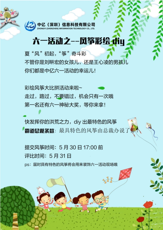 在六一儿童节来临之际,深圳平博pinnacle体育集团即将开展“DIY彩绘风筝大比拼”活动,DIY彩绘风筝既能让大家回顾儿时的快乐,也可以在原有的风筝艺术上创新,令其重新焕发生机!